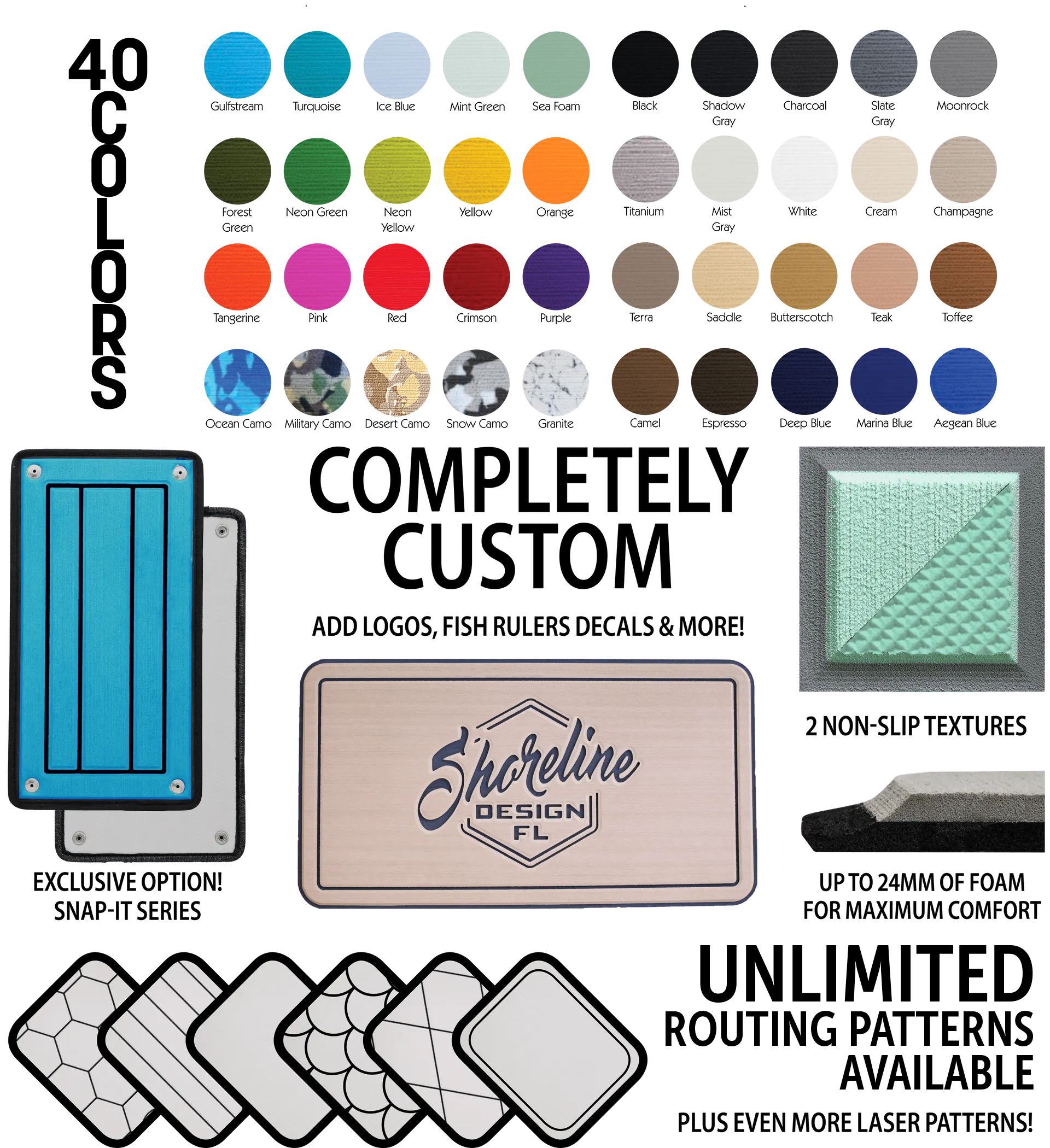 Explore our Design Gallery to see the range of possibilities Shoreline Design can bring to your boat. From sleek and modern patterns to timeless and classic styles, the options we provide are designed to complement every aesthetic. Let our collection inspire you as you envision the perfect look and feel for your project.